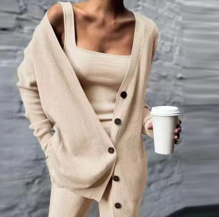 Upgrade your wardrobe with our stylish and comfortable knitted three-piece set, designed for the transitional seasons of spring and autumn. Featuring a jacket, vest, and pants, this set is perfect for any occasion. Stay fashionable and cozy with this must-have ensemble.